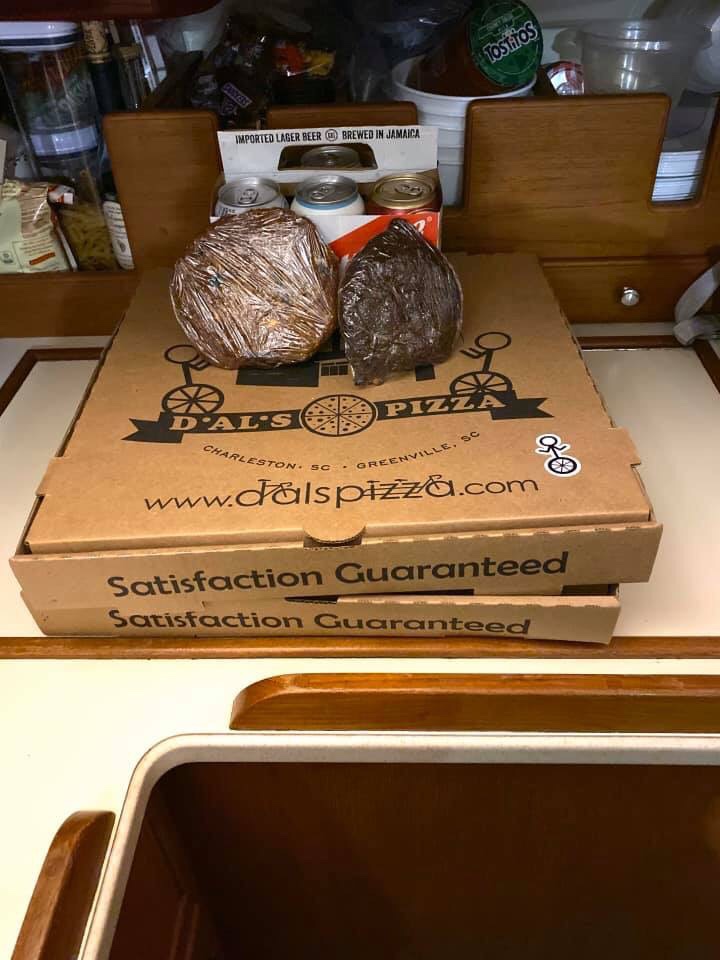 The wind was brisk today, there were waves and white caps on the ICW. We traveled from Georgetown SC to Charleston SC, it’s still cold, temperature was in the low 50’s. When Luke lived here in Charleston, he was friends a pizza shop owner Ben D’Allesandro, also an Eagles fan. He told Luke when we arrived he’d bring us pizza, He did, along with a six pack of local craft beer, and cookies from a local bakery. It was the best pizza! If you’re ever in Charleston be sure to stop in D’Als Pizza. Our new friends from sv Gander we’re invited to join us, Renee came over, Josh and Jeff had dinner with an old friend but stopped by later.