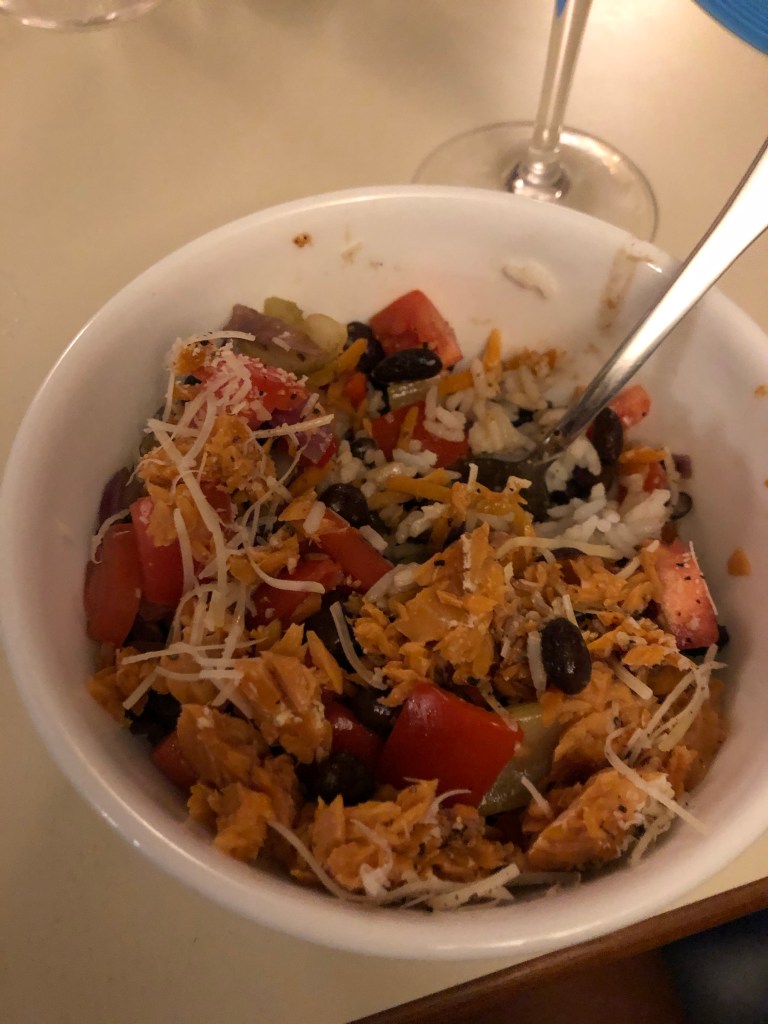 For dinner Joy and I made smoked salmon over rice with sautéed black beans, bell pepper, onion, fresh raw tomatoes topped with shredded Parmesan cheese.