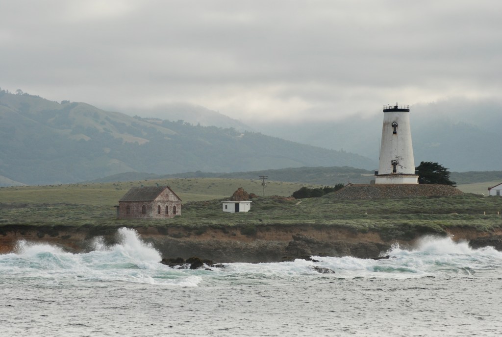 The Hearst Castle was slightly visible from the water, on top of the hill surrounded by fog.