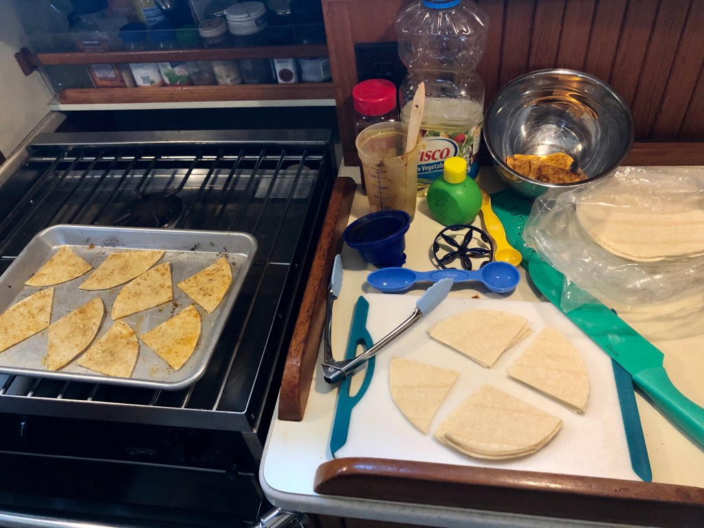 Tuesday June 9- rain day, or should I say rain delay. Back in Richmond, California, 3 weeks ago, at a restaurant we also purchased a produce bag. In it was a stack of 6 inch tortillas. They’re not very fresh right now, so I’m turning them into baked chips. I brushed them with a mixture of oil and lime juice with Cumin and Chili powder.