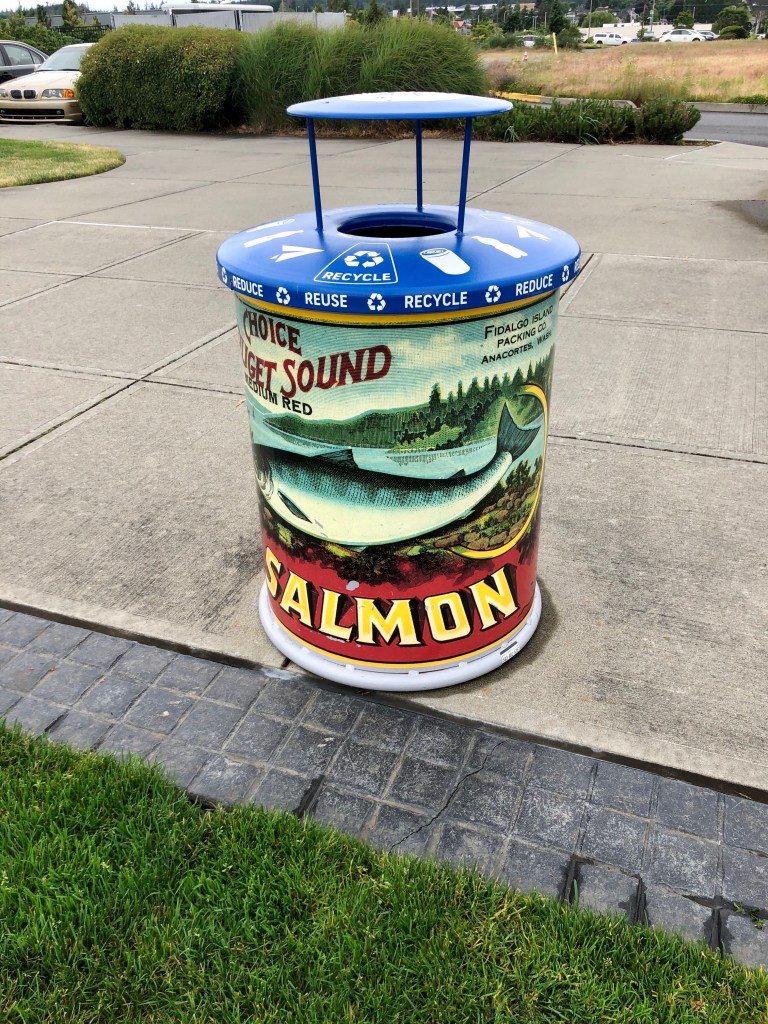 Trash/recycle cans around the marina are all designed to look like vintage cans of salmon.
