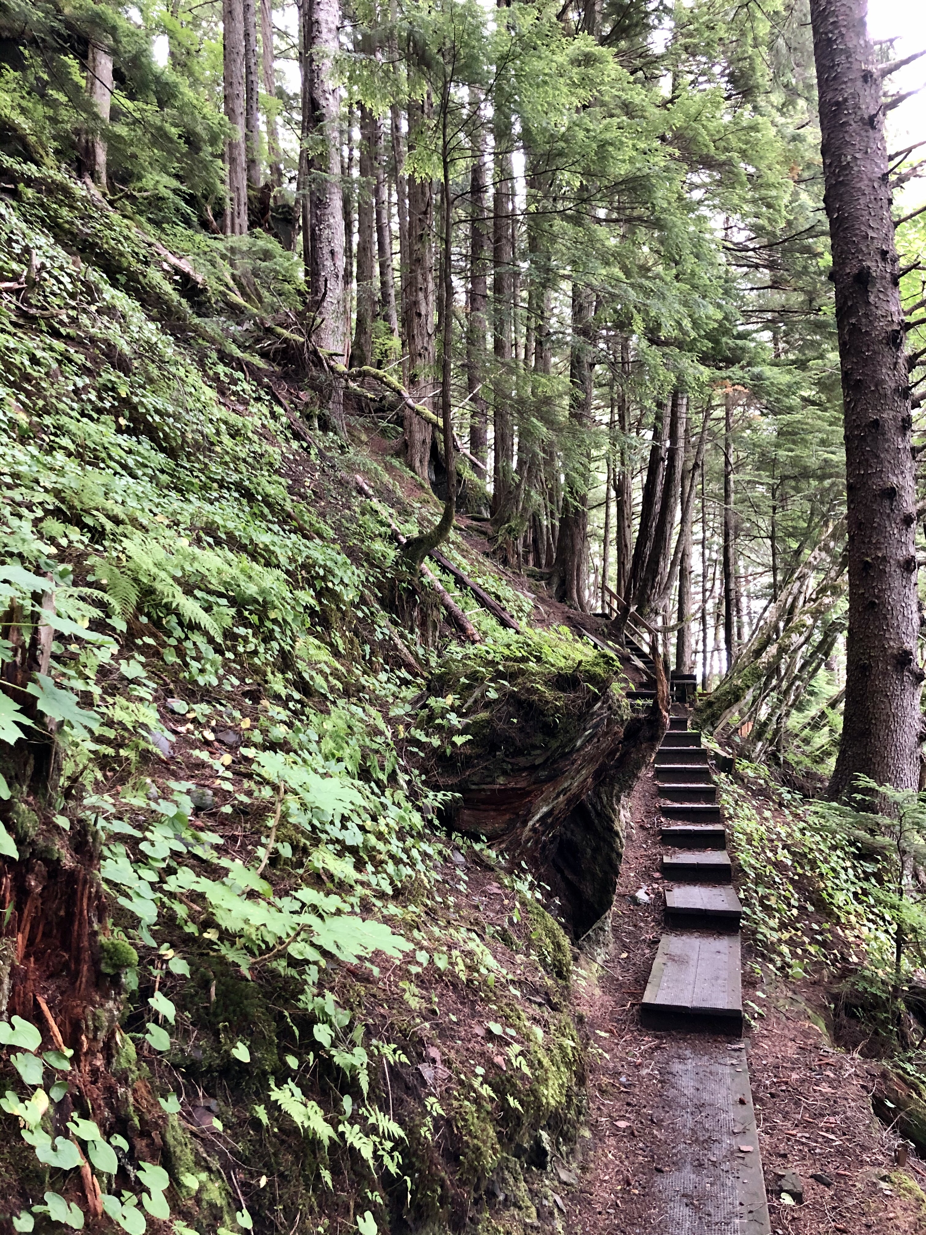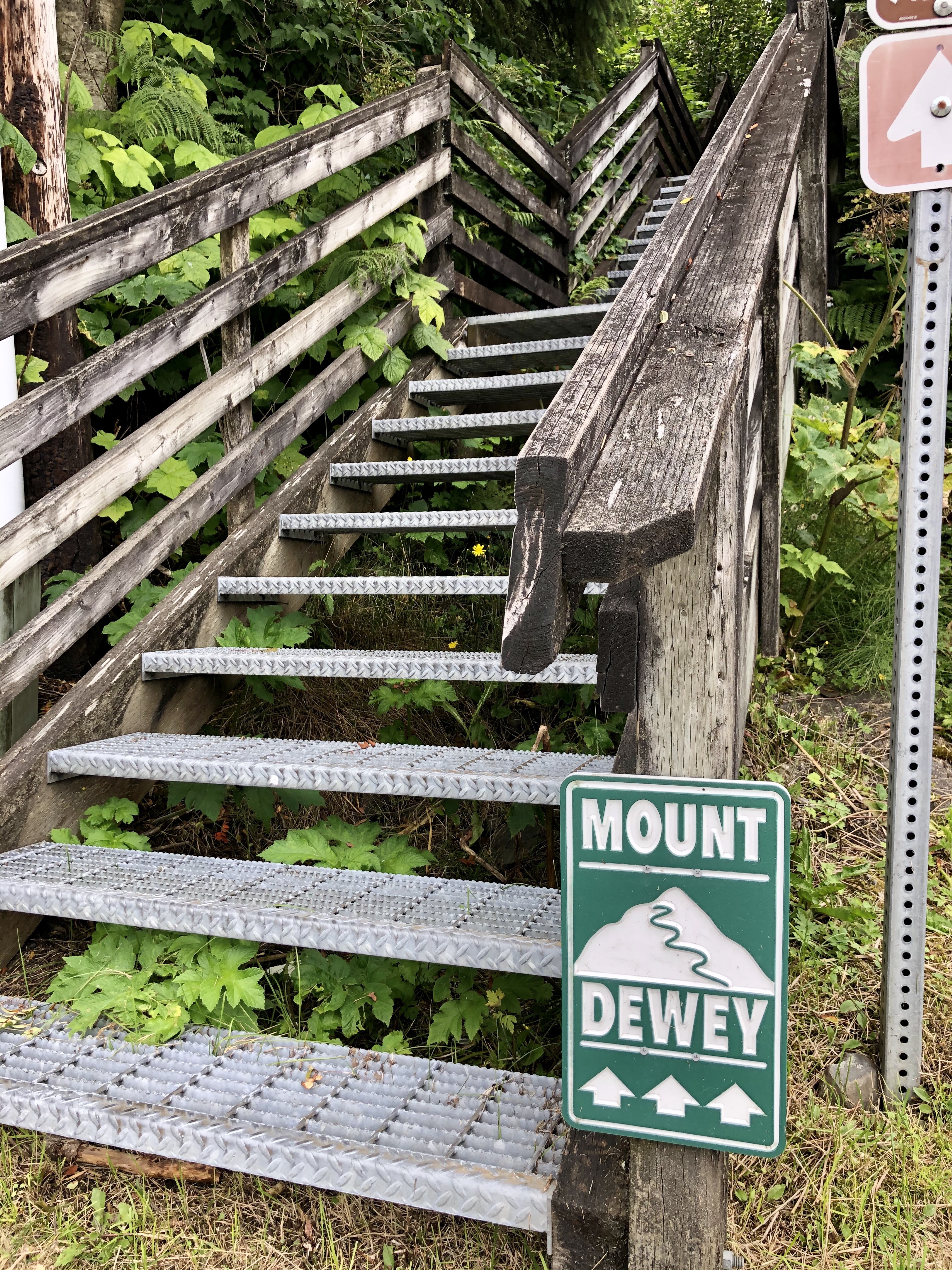 My. Dewey Trail, 1/4 mile one way, 300 ft rise boardwalk trail ending at platform overlooking Wrangell and the Zimovia Strait.