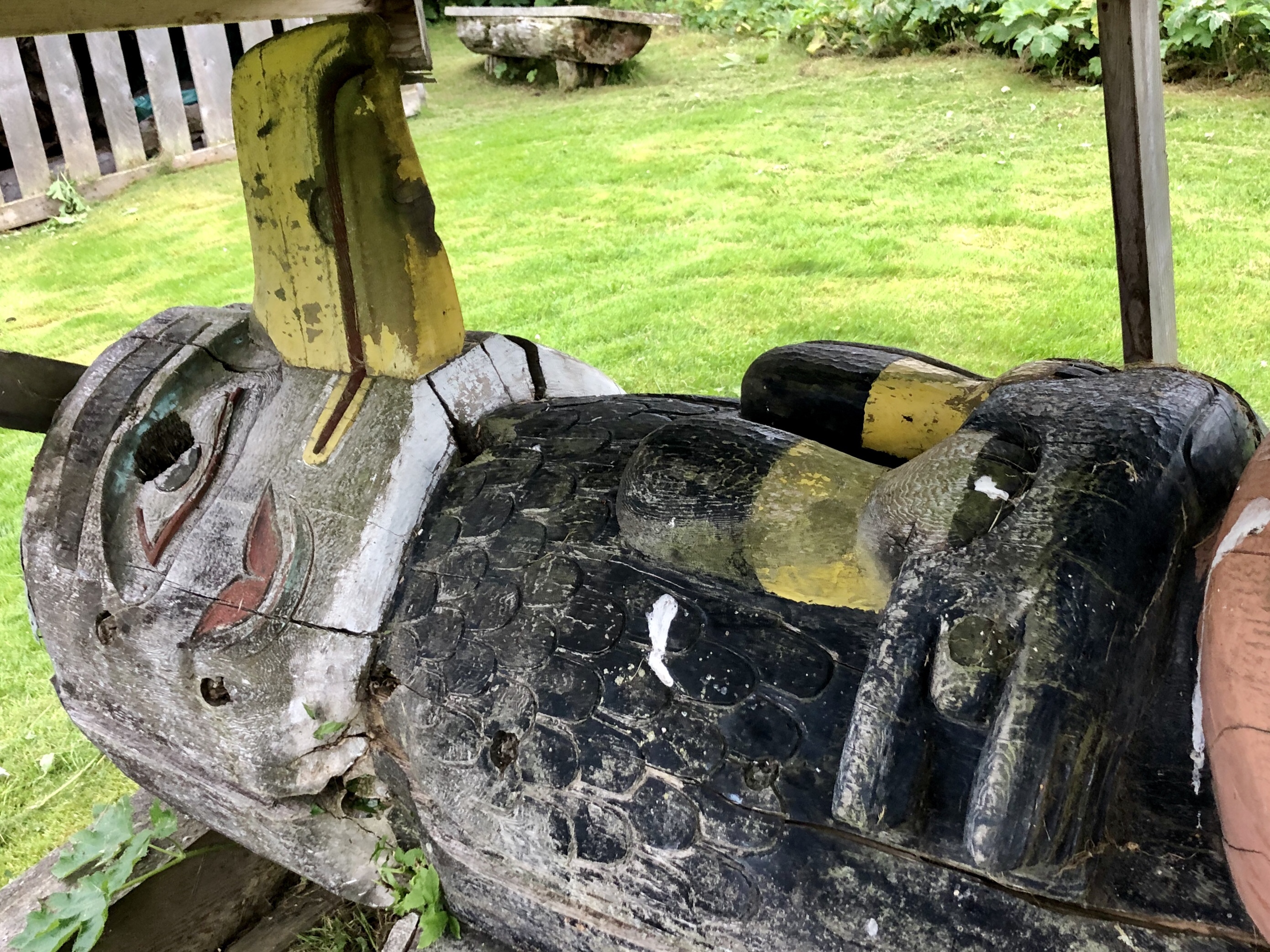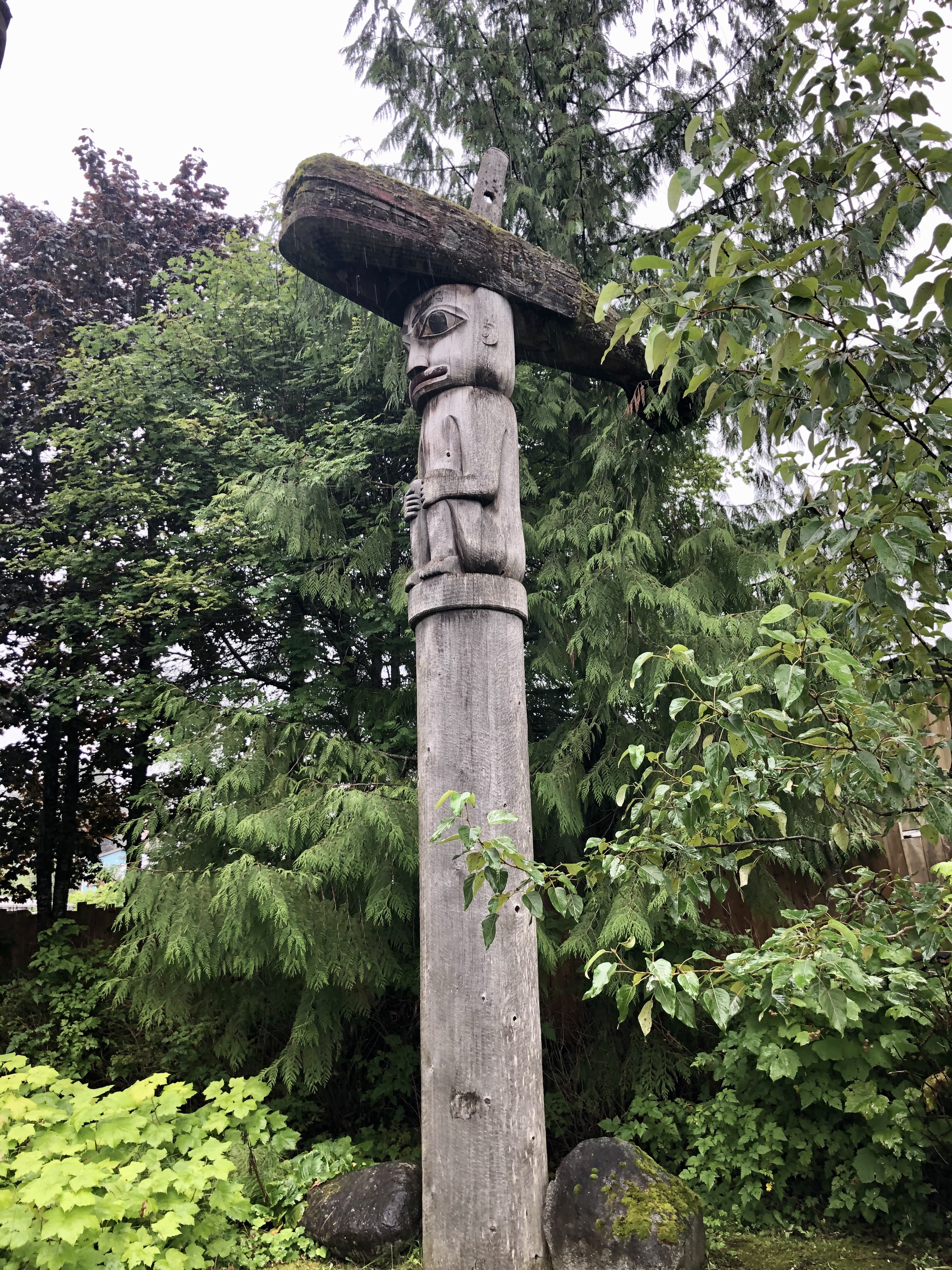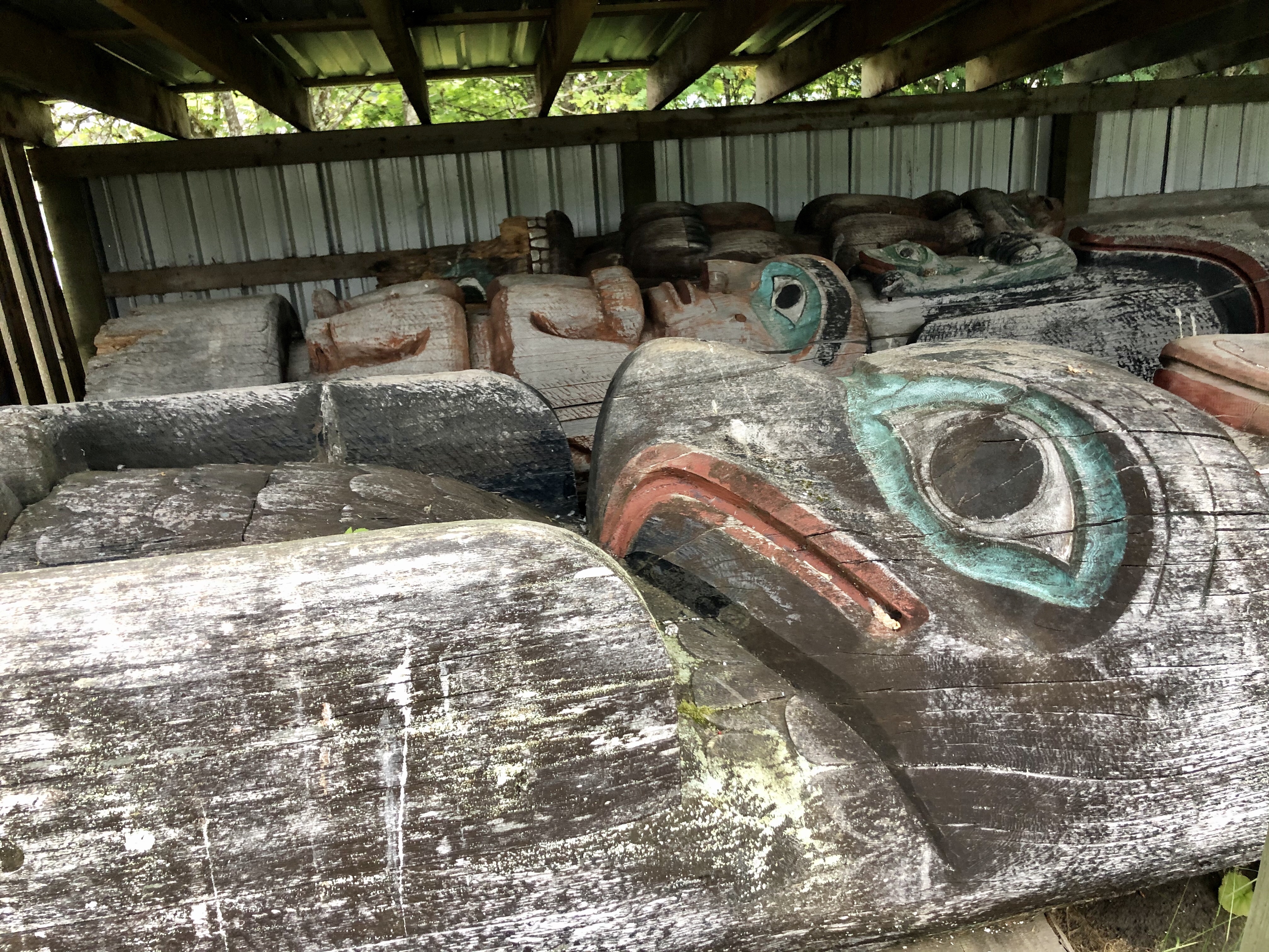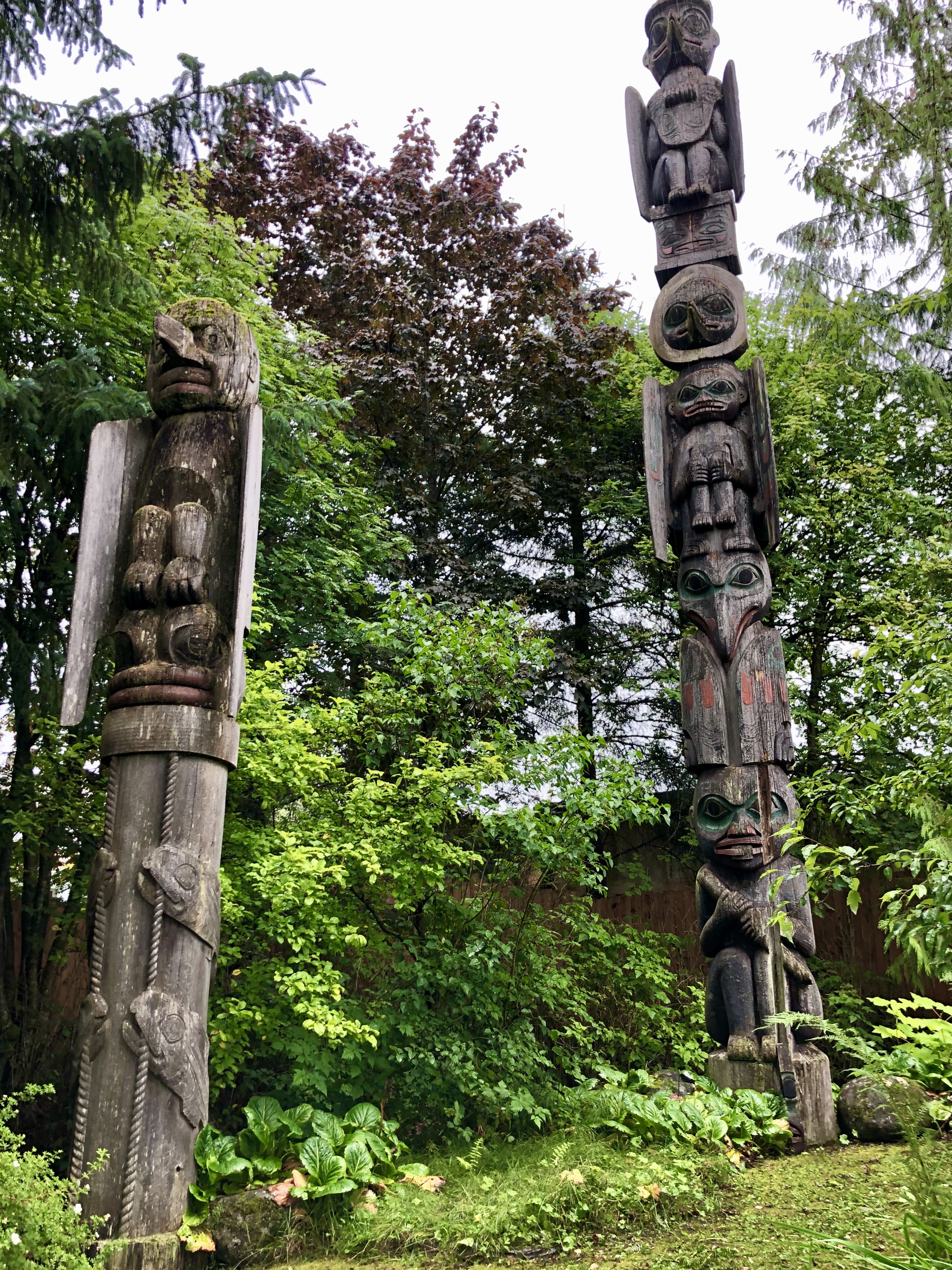 Totem Park, tucked away in a garden behind some trees, stand several totems left to rot naturally.