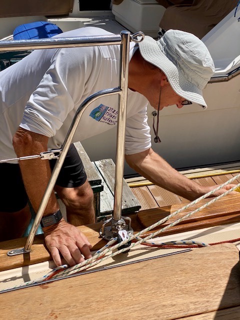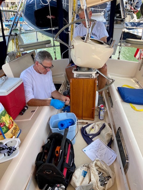 Thursday September 24, at noon, it was 87F feels like 91F. Nice breeze coming through the cockpit as Dan and Larry try to tighten the “play” in the wheel, always “Tinker Dan.”