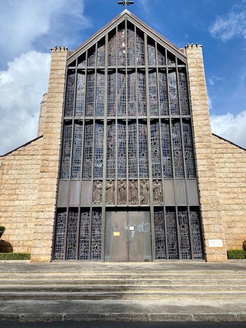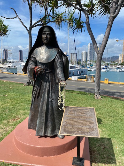 On the right-Saint Marianne Cope, in 1883, Mother Marianne Cope along with 6 sister, member of the Sisters of St Francis of Syracuse, New York, arrived in Hawaii to care for the leper’s on Molokaʻi and aided in developing medical infrastructure in Hawaii. Despite direct contact with the patients over the years, she did not contract the disease. Cope was Beatified in 2005, canonized in 2012. Her statue is located in Kewalo Basin Park.