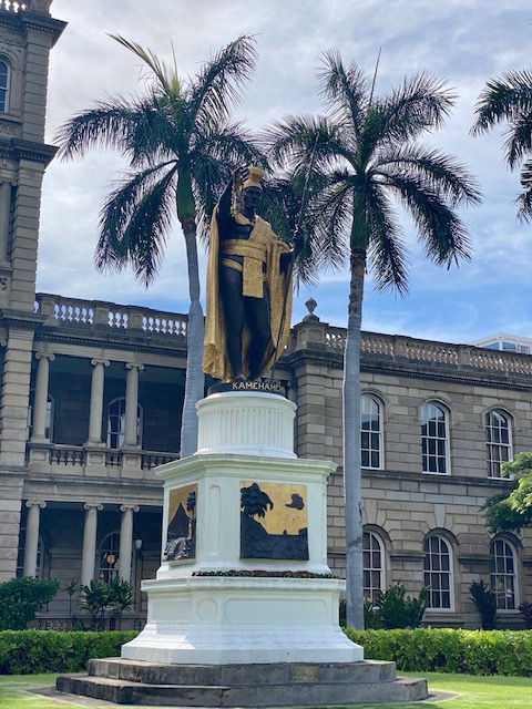 King Kamehameha I Statue, he united the Hawaiian Islands into one royal kingdom in 1810 after years of conflict. This statue stands in front of the Hawaii Supreme Court building.