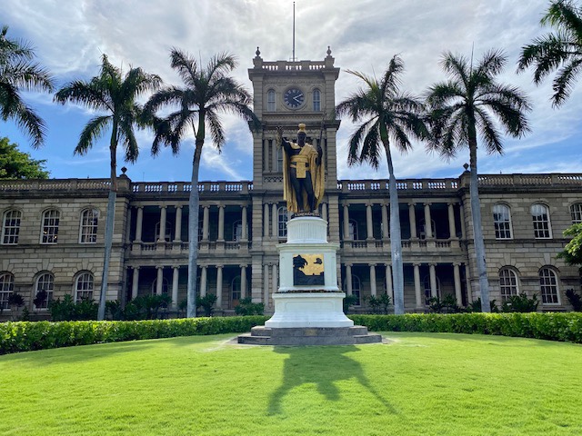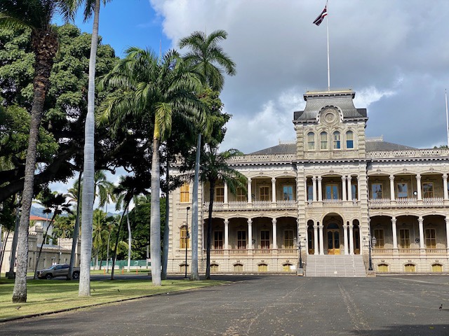 Across the street from the Supreme Court house is Iolani Palace, former residence of the Hawaiian monarchs. The only official state residence of royalty in the United States. Two monarchs, King Kalakaua and his successor, Queen Liliuokalani (his sister) lived there from 1882 to 1893.