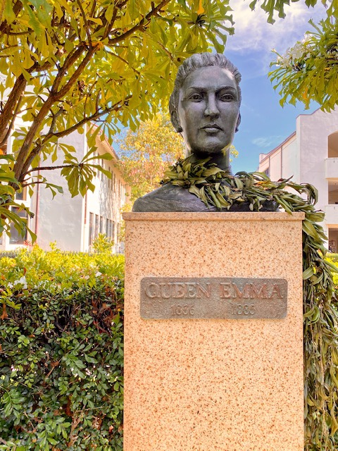 On the left- Emma was queen of Hawaii as the wife of King Kamehameha IV from 1856 to his death in 1863. She was a candidate for the throne but King Kalākaua was elected instead. This bust is in Queen Emma Square.