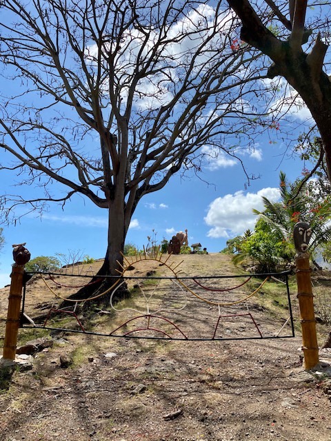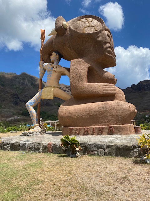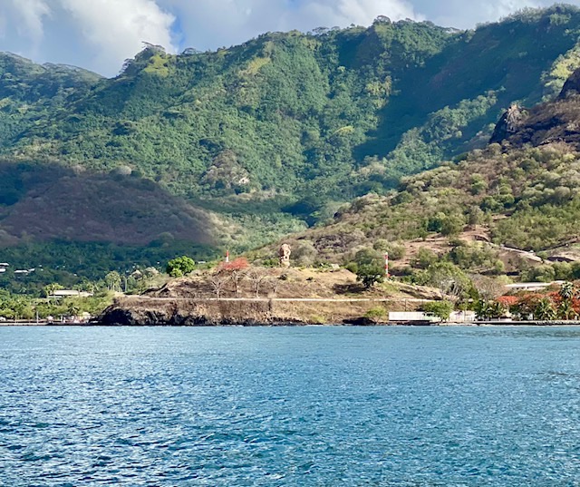 Upon this hill used to sit Fort Madison, named after President James Madison. It was the first naval base the US had in the Pacific. Built in 1813 to protect the village from the British. Only attacked once, the fort was abandoned in 1814. Later renamed Fort Collet by France. In 2013 it was returned to the local authorities. In 2016 they voted to erect a modern monument expressing Marquesan culture, Tiki Tuhiva. The woman tiki stands 40ft high, the warrior is 26ft tall.