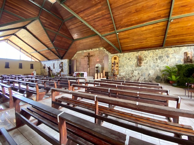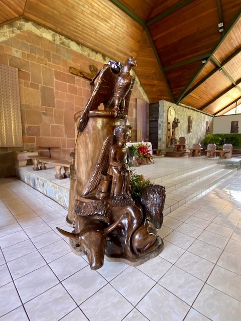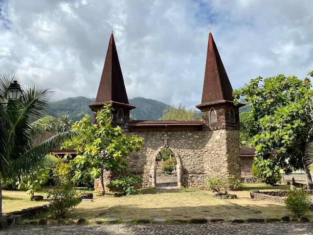 Soon after the island became under French rule, Catholic missionaries started spreading their faith. In the late 19th century, the cathedral was built. All that remains of the original building are the two bell towers, which stand at the entrance of the compound. The new church was completed in 1977. The pulpit and stations of the cross we carved from whole Tamanu trees.
