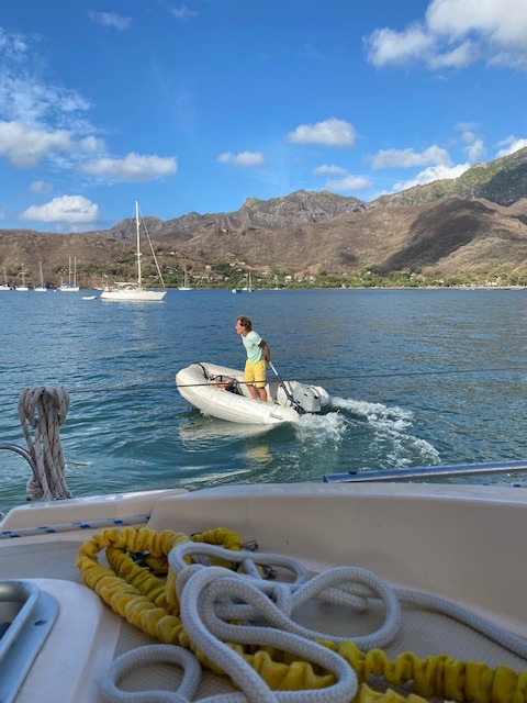 Tuesday December 22, this morning at anchor, we see this Island Packet 380 coming towards us. It was s/v Fleur. He dropped anchor next to us, (that’s what Island Packet owners do) Nick from the UK, we met him at Shelter Bay Marina in Panama. Dan had helped him install new solar panels on his boat there. Fleur transited the canal a week before we did. He’s been sailing solo around the islands of French Polynesia for the past year. Nick mentioned his birthday is this weekend, he’ll be 70 years young.