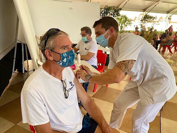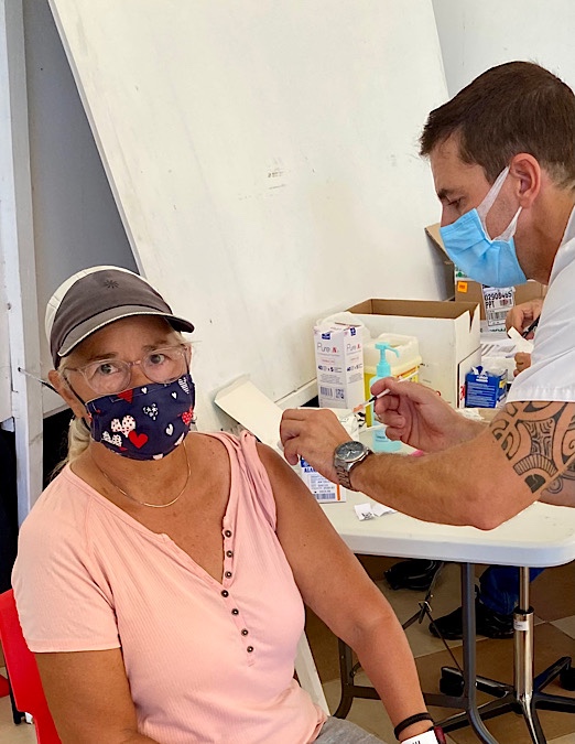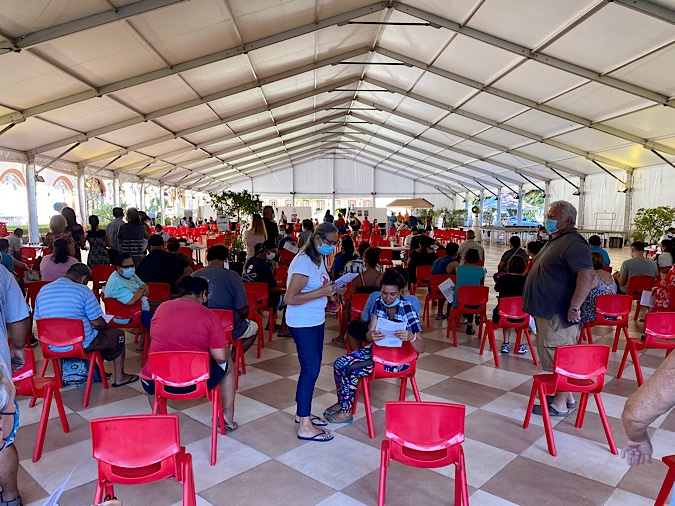 Saturday March 13, this morning along with two other boats here, s/v Tiapan and s/v Bliss, received our first COVID vaccine. We walked to the Presidential Palace where they had set up a mass vaccination center, no appointment needed. It was held under an outdoor pavilion. The process was relatively quick, less than 1.5 hours, there were close to 700 people. Numbers were handed out to those in line for counting purposes as they had 1100 doses available this day. We were also given a date for the second shot. There will be several mass vaccination centers around as they are eager to reopen the country.