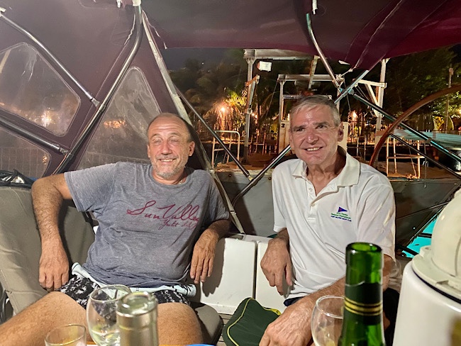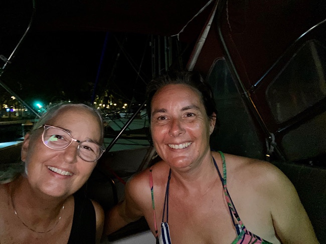 In the evening sundowners on our boat with Didier and Magaly. I made a Buffalo chicken dip served with chips (an American dish), accompanied by red wine from California.