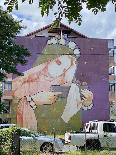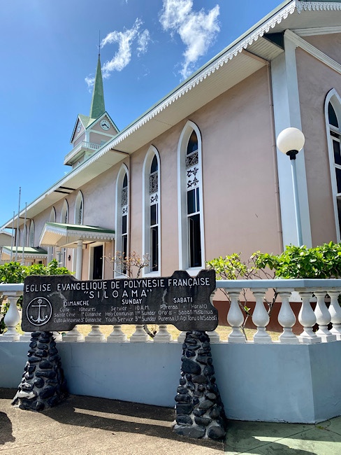 The small chapel is Chapelle de l’Évêché, Capel of the Sacred Heart, built in 1877 by Brother Théophile, remains one of the oldest buildings in Papeete. The grounds surrounding it are Gardens of the Bishopric, gardens of the bishop. It is very lush with many plants, flowers and trees.