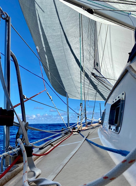 Our buddy boat s/v Ocean Sapphire, a 46’ catamaran really flies in these conditions (a little behind beam reaching with 10-13 knots of wind, calm seas), and they are out of sight ahead of us. Eventually we’ll catch-up.