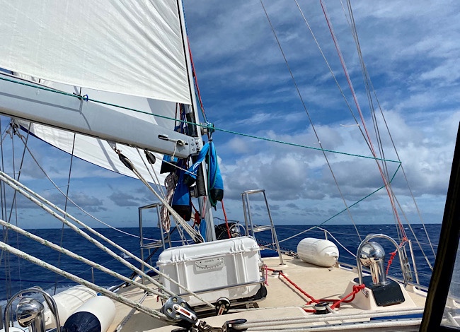In these close reaching conditions we, and s/v Ocean Sapphire, double reef sails. As a result we passed them, since they don’t have their big a$&@ mainsail all the way up and out… playing leap frog in the Pacific.