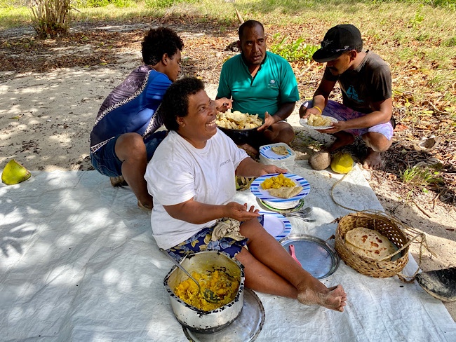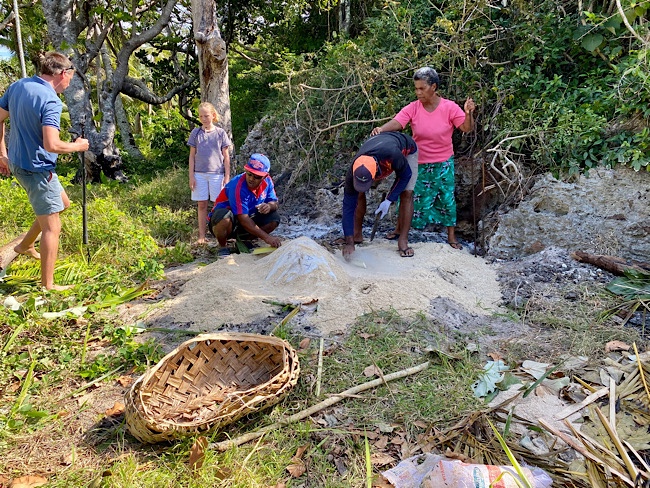 Saturday July 10, All land in Fiji belongs to individuals, little is owned by government. When arriving at a remote island in Fiji, it’s customary to visit the Village Chief for a ceremony, and present gifts of kava root and other useful items (rice, bottles, gasoline, sometimes money, etc.) for the villagers. During the ceremony the Chief will grant permission to remain and explore the village’s portion of the island. This now makes you an accepted village member. This process is known as Sevusevu. It’s asking permission to be there on their land and water. In other words, you wouldn’t “camp” in your neighbors yard without permission. In normal times, prepared kava or grog would be shared with all to drink using a communal half coconut shell. Kava or grog is a mild narcotic drink. Typically a male thing, kava is consumed at the end of a work day, men would gather sitting cross-legged and drink grog. However because of COVID, villagers are asked not to share the beverage.