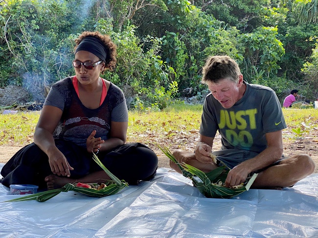 Wednesday July 7, at 1 pm s/v Barracuda, s/v Venture Lady, s/v Estran, s/v Windflower, s/v Quokka2 and us, all met at the landing to have a feast with the villagers. Because of COVID restrictions, they did not want us to go to their village so this was held at a neutral location. It was a pot luck meal with the villagers supplying a pig that was cooked in the ground. After lunch music was played and songs were sung a little bit of dancing too.