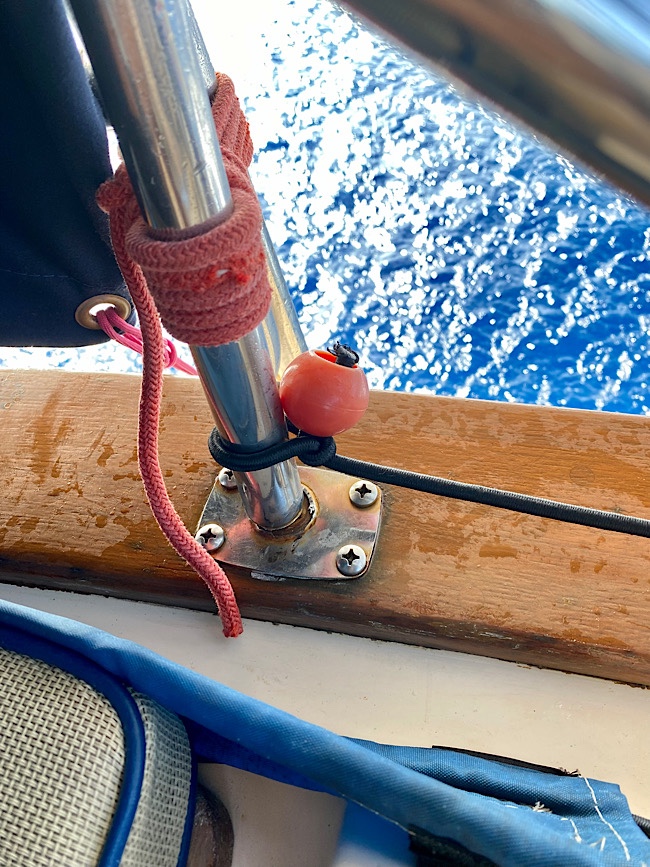 Another failed stainless steel weld. This post is part of the aft pulpit on the transom. Dan securely tied it to the swim ladder.