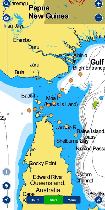 We purchased a book titled “Ken’s Torres Strait Passage Guide”. It’s 50 pages of mostly maps with navigation waypoints that meander around reefs and islands. Raine Island marks a navigable entrance to the Great Barrier Reef. There are 71 islands within the reef, 17 are inhabited. There are also a multitude of reefs.
