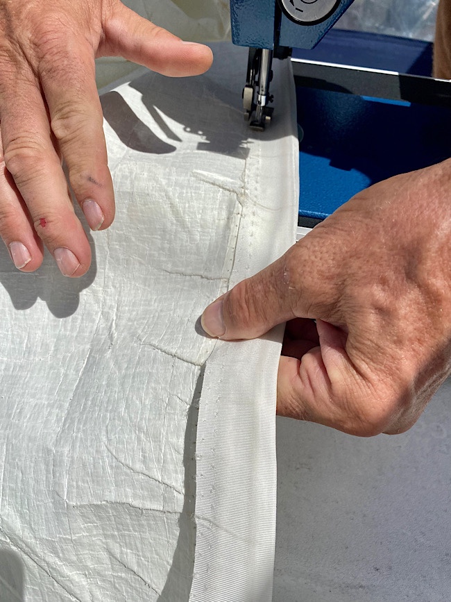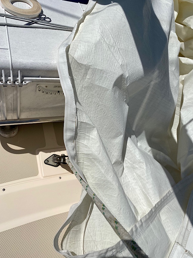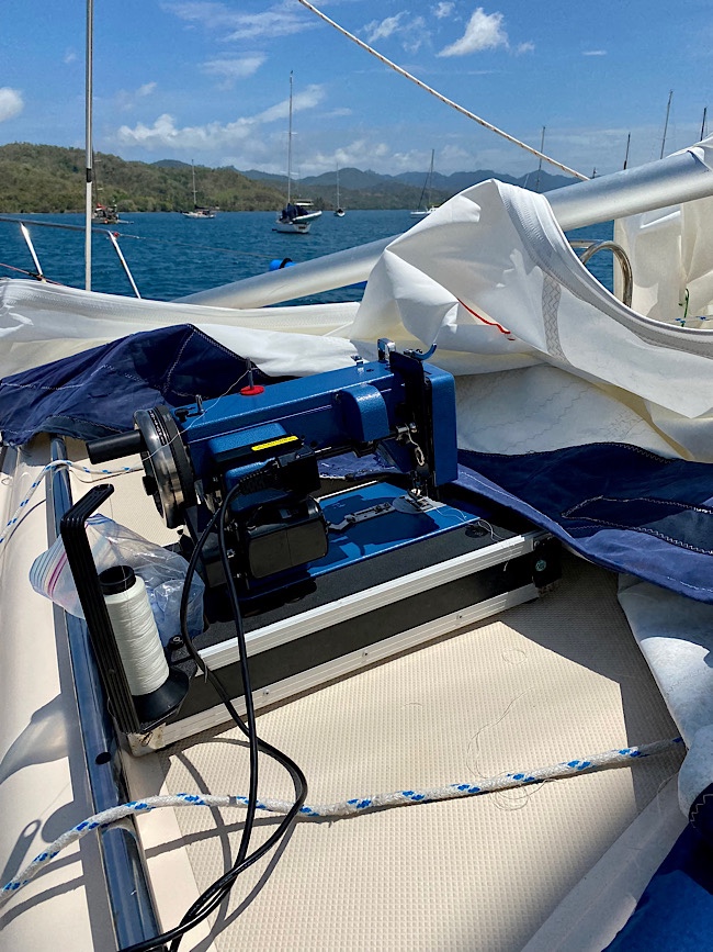 Sail repair #3, the Main. The wind calmed down just long enough we decided to drop the mainsail. Stitching along a large section of the tape on foot had come out. With the sewing machine on the deck, that area was resewed, with Dan adjusting the tape as I sewed. Then we reinforced the tape on the entire foot of the sail, sewing the length of it.