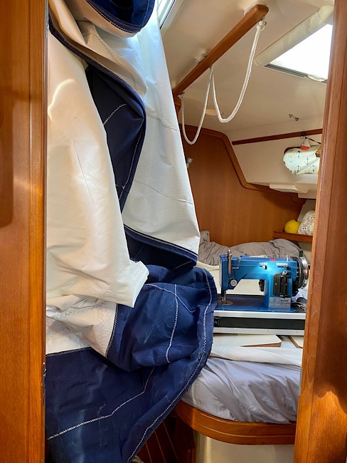 Wednesday September 8, Sail repair #2, the Genoa. At some point the leach line broke, it’s a line within the leach of sail to minimize its flutter, the leach of the sail has been fluttering horribly. The sail was lowered, Dan reattached the line, in doing so had to make a cut on the edge of the sail. We stuffed part of the sail through a hatch, put the sewing machine on the bed, to add a patch to cover the cut. Better than lugging the machine to the deck for a small sewing job.