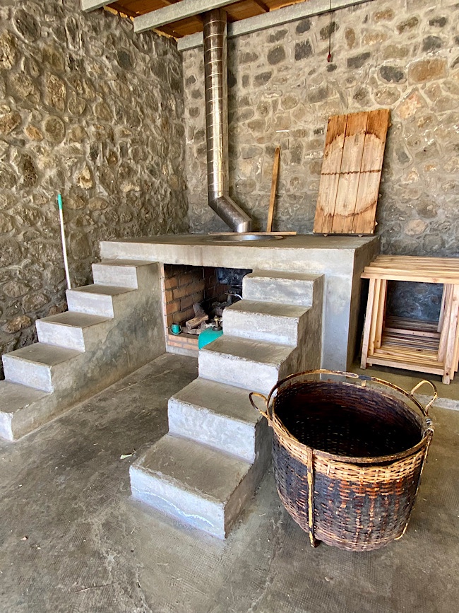 Vanilla pods are harvested when a yellow color appears on the bottom of the tip. To prevent the pods from splitting and loosing their flavor, they are blanched in 149 degree water for 3 minutes. A basket is used to immerse the pods in water. Quickly drained pods are placed in storage chests lined with blankets for 24 hours to make them sweat. This steaming process stage will make the color change from green to a chocolate color. Drying the vanilla begins outside with sun drying for about two weeks, the pods are then placed on racks indoors for 2-3 months. The dry vanilla pods are then placed in teak storage chests for a year to mature.