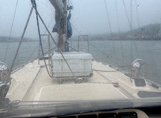 Slippers on boat, perfect for this damp rainy day. Our full cockpit enclosure keeps us dry.