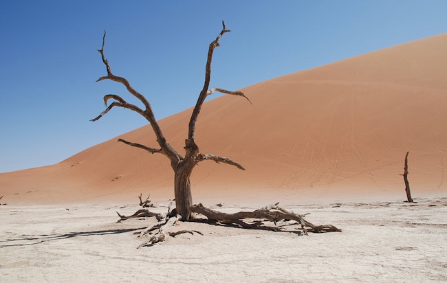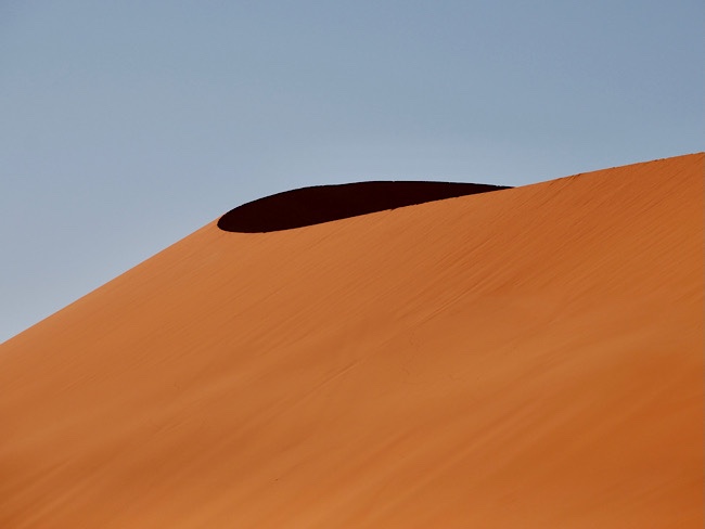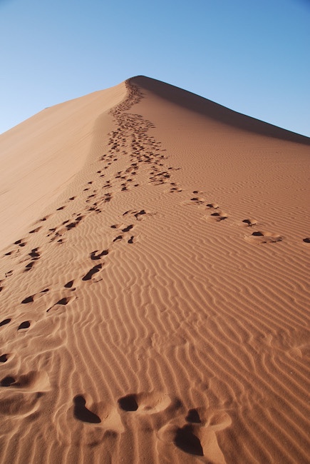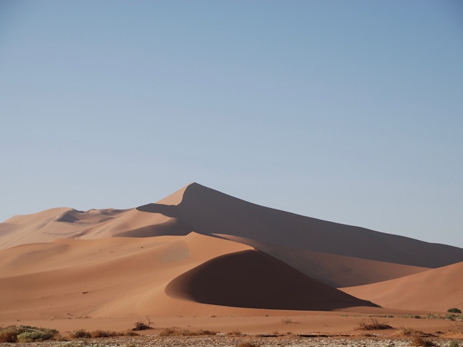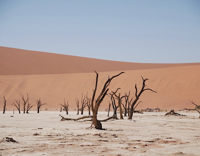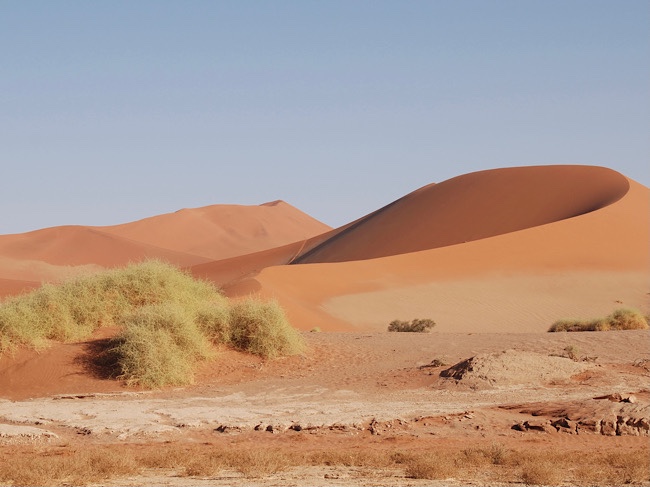 Sossusvlei is a white salt and clay pan known as Deadvlie. Remnants of a once river marsh with dead trees, surrounded by very large red dunes of million years old sand. Dune 7 is the tallest in this desert over 1256 ft, it’s the 7th dune along the Tsauchab River. Big Daddy, which you are also allowed to climb is over 1066 ft. We climbed what the tour guide called Little Daddy. It is the long plateau before Big Daddy’s peak. Similar in height to Dune 45.