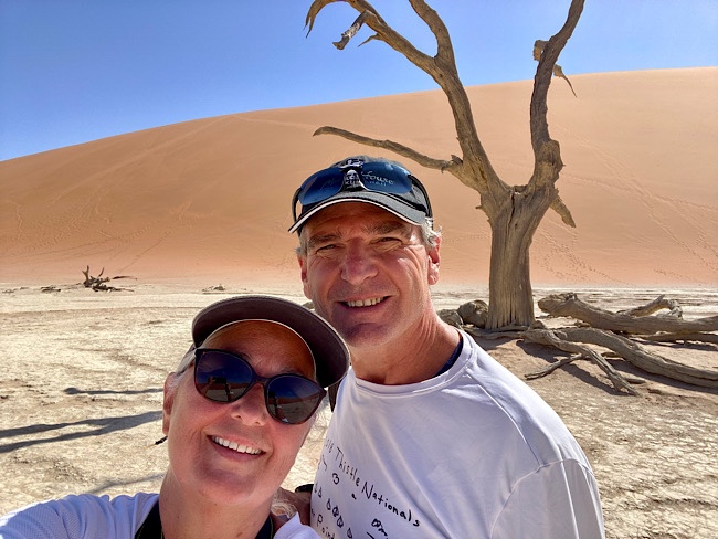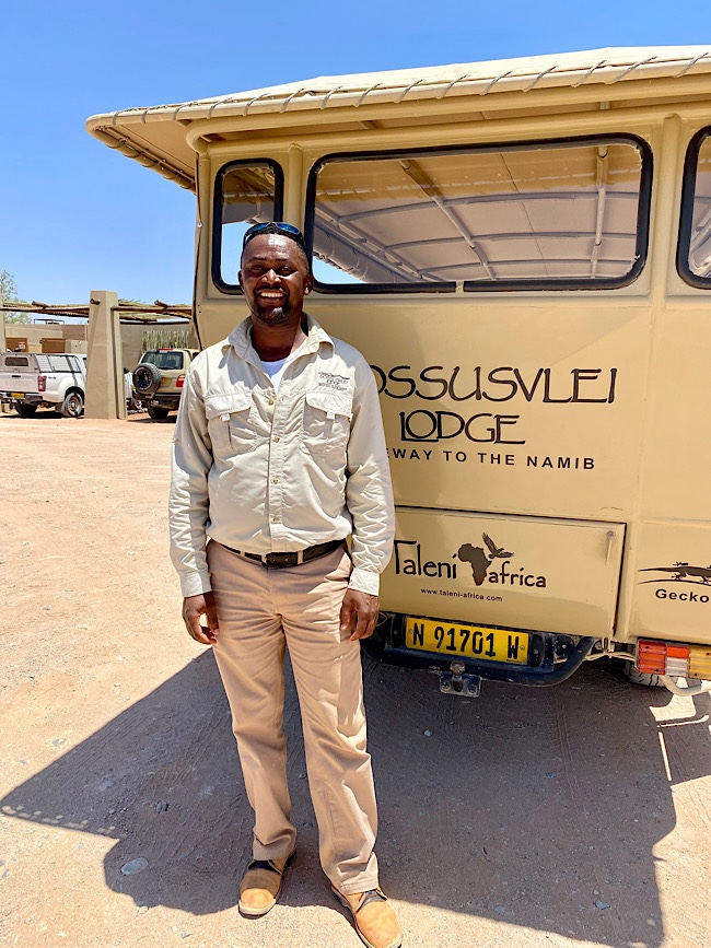 Saturday January 8, Also within the lodge was an Activity Center that organized a variety of tours. Our plan was to leave at sunrise to see Sossusvlei, but opted to go with a tour. There were two safari vehicles that departed at 6am, with 4 guests in each. First dune we stopped at in the Namib Desert, is called Dune 45. It is permissible to climb this Dune, it stands at 560 ft. The name comes from it being 45 kilometers from the road that connects the Sesriem gate and Sossusvlei.