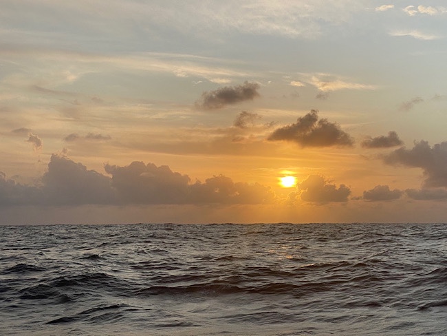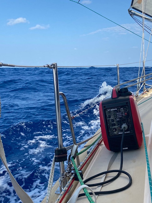 The batteries don’t seem to be holding a good charge throughout the night. Which is surprising since there is so much sunlight during the day. On the other hand, the autopilot (sailing downwind in sloppy waves) requires a lot of electricity. Also, the refrigerator is running longer, since the tropical air and water is warmer. So Dan dragged-out the portable generator to give the batteries a boost rather than start the boat’s engine.