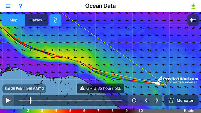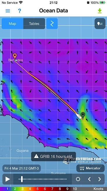 We are heading toward shore to catch a ride in the North Brazil Current. It is a well-established western boundary current that carries warm water from the South Atlantic northwest along the coast of Brazil, across the equator and into the northern hemisphere.The Mercator current chart shows a 3-4 knot current flowing northwest. We’ll jump on the ride for awhile then turn north to Barbados. There is also less intense wind closer to shore. This is also the path all the PredictWind weather routing models take.