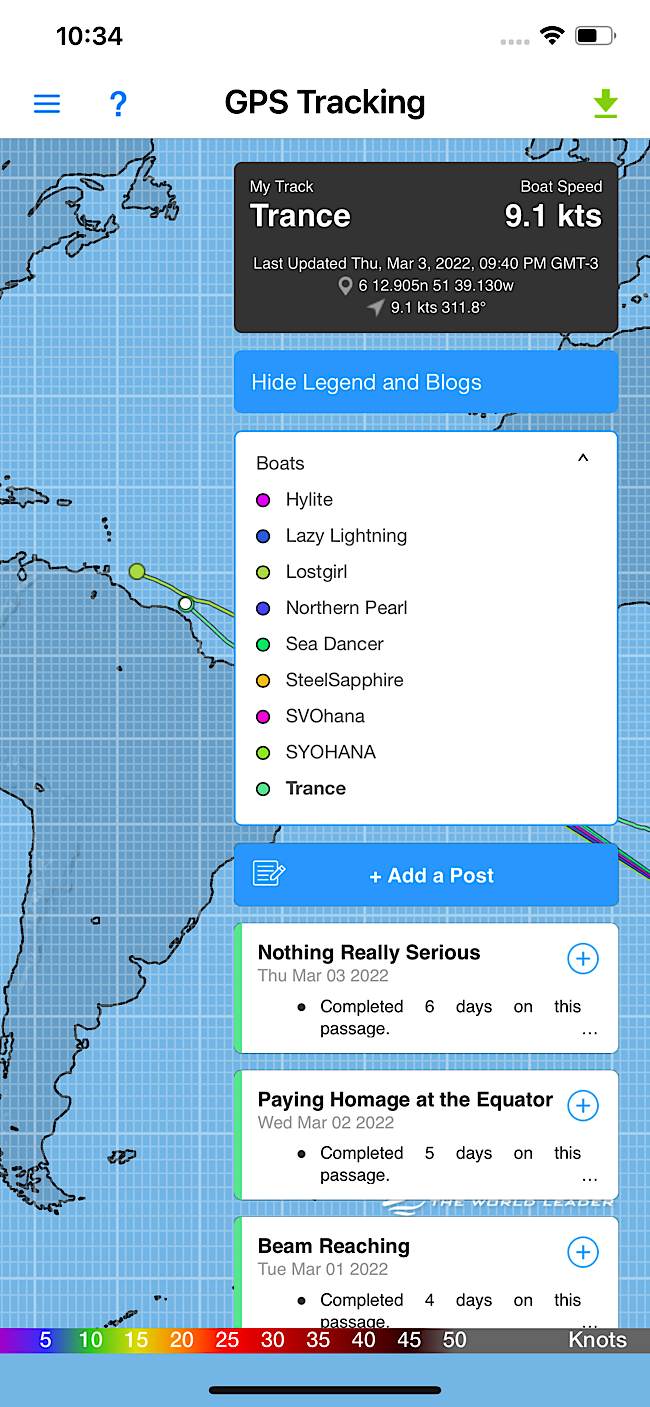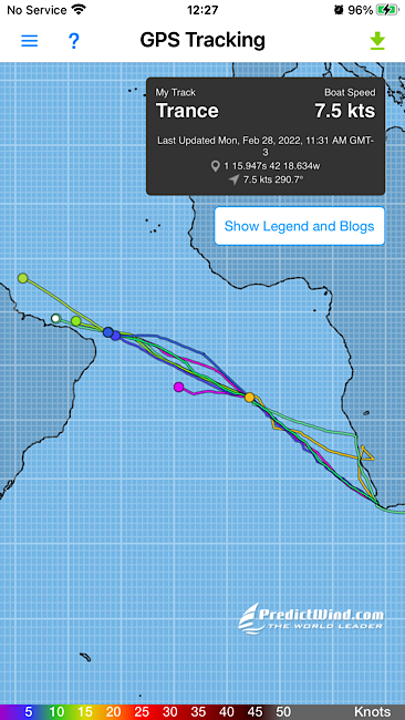 Wednesday March 2 – Day 6, Total nautical miles traveled 991, 216 nautical miles traveled in the past 24 hours. Trance breaks a new distance traveled per day record!