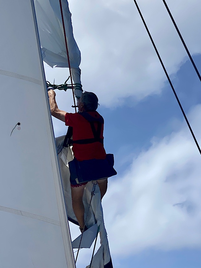 Upon reaching another waypoint, an eight degree turn to starboard was made. The Genoa fluttered a bit then a huge tear appeared in the sail, not near the small tape repairs we recently did. Then another tear, next thing we see the sail totally shredded! While we were furling it in the flapping sail cloth wrapped around the forestay. We would have preferred to leave the sail furled but the top half of the sail was loose and flapping. We had to unfurl the sail to drop the halyard. This was difficult because the sail wa so twisted around the forestay preventing the sail to unfurl. In 20knots of wind I raised Dan up in a bosons chair on another halyard so he could cut the sheets as well as part of the sail so we could take it down. What an afternoon!