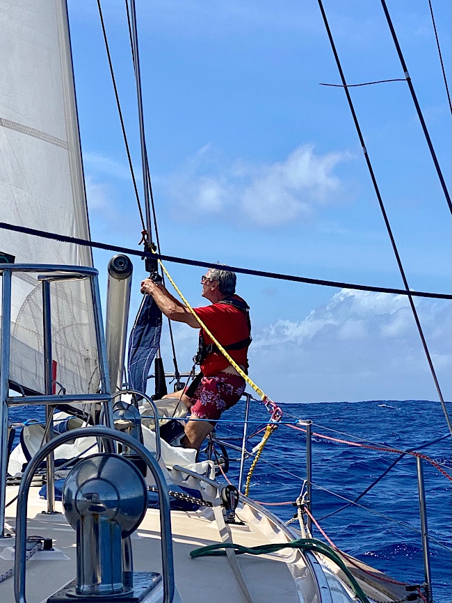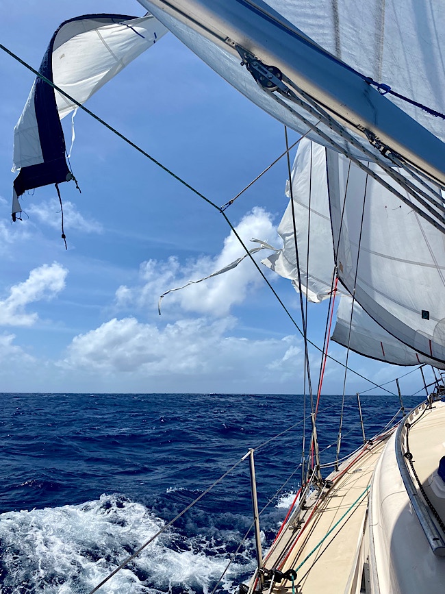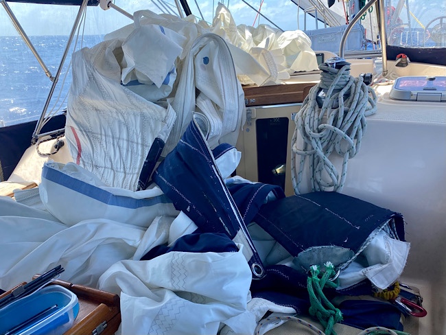 Yes ripped beyond repair! We used the staysail like it was a Genoa she did great! It happened actually a few times to us especially at night where we’ve asked a ship to alter course for us. Rules of the road on an open, ocean sailboats under sail have right of way except to a fishing boat that is trawling.