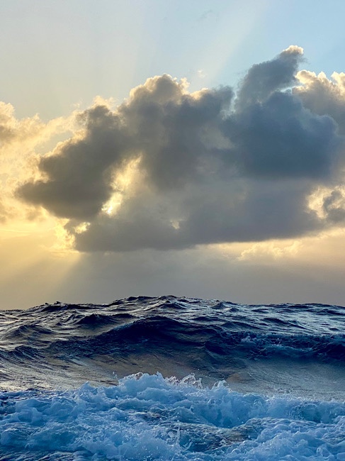 The wind has been 16-19knots all day with 6-9ft waves, it’s a very bumpy ride! SOG 6.5-7.2knots.