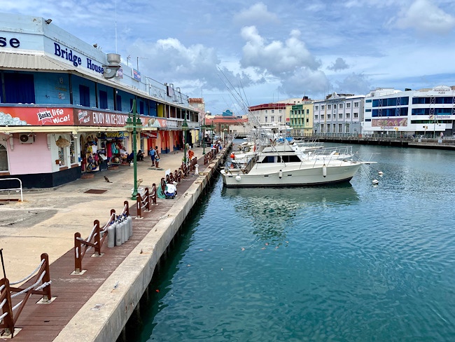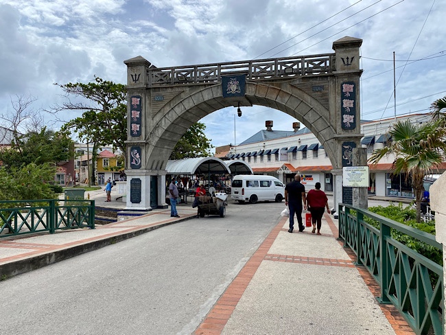 Tuesday March 8, at 6:30 am we were awoken by dock workers who wanted us to leave as a cargo ferry needed to dock where we were. We left and anchored in the bay. After getting settled, we took the dingy into Bridgetown to find a restaurant for breakfast. There is a dingy dock up the river under the lift bridge we parked at.