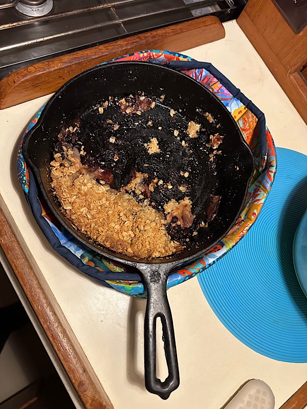 Saturday, June 28, 2025 chilly rainy day today. We had dinner aboard s/v Henry. Wendy made a pasta dish incorporating salmon and green vegetables. I baked an apple, blueberry crisp for dessert, it was almost all gone!